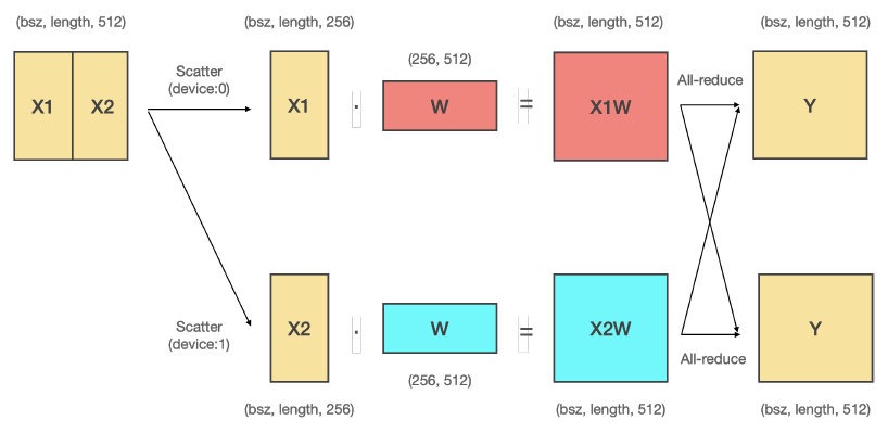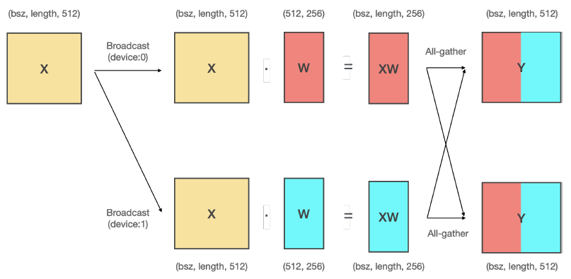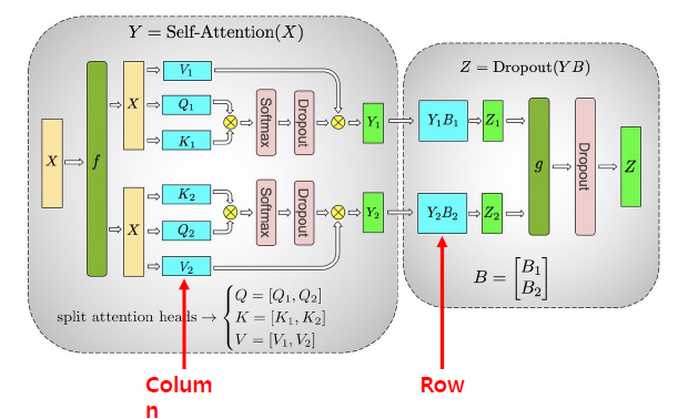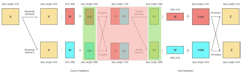 - Column-Row 순서대로 2개의 Liner 레이어를 연결함 : All-Gather와 Scatter 통신 생략 가능함